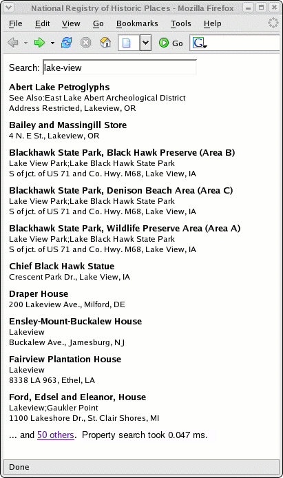 nrhp.jarwhen creating your database.Servlet Your servlet should accept an input string as the request parameter to a GET request. Results should include the information for a pre-configured number of properties (e.g. 10), the total number of matches which exist in the database, and the time taken by your search algorithm. Your servlet should be stateless, ie. not depend on any per-user session information. Paginate your additional results as a bonus!
